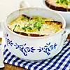 Fördela soppan i fyra ugnsfasta skålar. Lägg en brödskiva på toppen i varje skål och strö över den rivna osten. Sätt in skålarna under grillen tills osten fått fin färg. Var försiktig när du tar ut skålarna, det är hett!