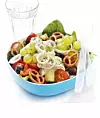 Fördela sallad, tomater, gurka, paprika och oliver i serveringsskålar. Toppa med osten och lökringarna.