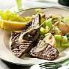 leverskivorna och lägg dem i pannan. Låt grilla till fin randighet, cirka halv minut, vänd och grilla andra sidan också. Strö på flingsalt och peppra efter stekningen.