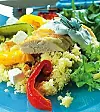 Lägg upp couscous med kycklingbitar och paprika, strö på avrunna fetatärningar.
