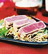 Grilla tonfisken, 20–30 sekunder på var sida beroende på tjocklek. Den ska vara rå i mitten, annars blir den torr och tråkig.
