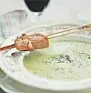 9. Tillsätt resten av champagnen i serveringsögonblicket så att soppan blir skummig. Servera den med kycklingspett.