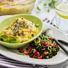 Grönsaksgratäng med citronmarinerade svarta linser