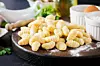 Bryt av äggstora degbitar och trilla till 2–3 cm tjocka längder. Dela dem i 2–3 cm breda bitar. Koka också upp mera saltat vatten i kastrullen.