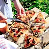 Ta upp och knåda degen på mjölat bord. Forma degen till fyra bollar platta ut dem till runda plattor. Kavla ut degplattorna till tunna pizzor.