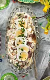 En härlig gubbröra som toppas med äggskivor och gräslök.