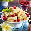 Bred ut smeten i en långpanna, 30x40 cm, klädd med bakplåtspapper och strö över hallon. Grädda mitt i ugnen i ca 30 minuter. Låt kakan svalna.