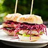 3. Bygg burgare genom att skära upp bröden. Lägg en liten klick rödbetsslaw och ett tillskuret salladsblad. Lägg på en skiva stekt ost och lägg sedan på en rejäl klick rödbetsslaw. Lägg sedan på överbrödet. Stick gärna ett halvt grillspett igenom burgaren så att delarna hålls på plats.