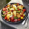Blanda samman alla ingredienser till dressingen och ringla den över salladen. Toppa med plockad basilika och servera genast.