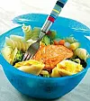 Hetta upp en stekpanna och woka grönsakerna i oljan på ganska hög värme, de ska bli genomvarma. Blanda med pastan i två rymliga burkar med lock.