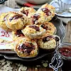 Klicka ut degen med sked i bullformar. Gör ett hål i varje bulle med mjölat finger och fördela sylten i hålen. Pensla med uppvispat ägg och strö på mandelspån och pärlsocker. Grädda mitt i ugnen, ca 12 minuter.