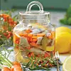 Lägg ner morot, lök, citron, havtorn och lagerblad i den varma lagen och låt den kallna.