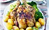 Hel kyckling i ugn blir en trevlig, klassisk helgmiddag, här med nya smaker. Servera dansk potatis till, det vill säga små kokta potatisar som steks i smör och socker.