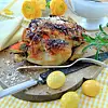 Sätt in kycklingen mitt i ugnen på 225º. Sänk värmen till 175º och tillaga kycklingen ca 1 1/4 timme. Köttsaften är ofärgad när kycklingen är genomstekt. Ös ett par gånger under tiden.