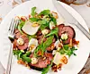 Skär köttet i en halv centimeter tjocka skivor och fördela på tallrikar. Spritsa lite smör på varje skiva. Strö över lök, rucola, pinjenötter och parmesan. Avsluta med lite flingsalt och nymalen peppar och droppa lite god olivolja över rätten.