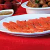 Häll sedan bort lagen. Skär fisken i skivor med laxkniv och lägg upp på fat.