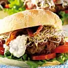 Lägg ihop hamburgarna med sallad, tomat, hamburgare, lök, bacon, groddar och dressing.