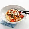 olja i en stekpanna och fräs vitlöken på hög värme tills den fått lite färg. Blanda ner sambal oelek och spenaten. Rör och fräs tills spenaten blivit mjuk. Tillsätt körsbärstomater, tomatpuré, kyckling och vatten. Låt stå och puttra några minuter och smaka sedan av med salt och peppar. Servera med nykokt pasta och riven ost.