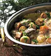 Bryn rulladerna, några i taget, i fett, salta och peppra. Häll över buljong och efterstek under lock på svag värme tills köttet är mört, ca 40–50 minuter.