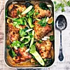 Sätt ugnen på 175°. Skölj kycklinglåren och torka väl. Fördela i smord ugnsfast form. Salta och peppra.
