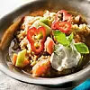 Blanda yoghurt med strimlad färsk mynta, smaka av med lime­skal, limesaft och salt. Servera som sås till linsgrytan. Toppa grytan med skivad paprika. Bröd och ost till.