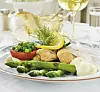 Skinna av och filea fisken före servering. Lägg upp på tallrikar med sparrisen. Servera med skarpsåsen och färskpotatis.
