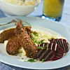 Stuvad potatis: Koka upp potatis och mjölk i en gryta. Tillsätt crème fraiche blandat med mjöl och rör om. Låt sjuda i 5 minuter. Smaksätt med senap, salt och peppar.