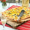 Rulla ut smördegen på en plåt med bakplåtspapper. Vik upp en kant runt om. Bred potatisblandningen över smördegen. Fördela lök och ansjovisfiléer över. Grädda mitt i ugnen i ca 20 minuter, tills smördegen är frasig.