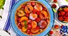 I pajskalet hittar du nektariner, persikor och jordgubbar på en bädd av mandelmassa. Servera pajen med en klick vispad grädde.