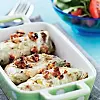 6. Lägg dolmarna tätt med skarvarna nedåt i en smord ugnsform. Håller de inte ihop kan du "låsa" dem med tandpetare. Slå på buljongen. Baka i ugn i ca 30 min.