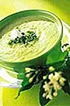Späd den med buljong och vispad grädde till lagom soppkonsistens. Smaka av med salt och klipp krasse över. Kyl soppan före servering.