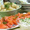 Pepparrotsgrädde: Vispa grädde och crème fraiche i en skål tills det blir tjockt och krämigt. Smaksätt med pepparrot, honung och salt. Lägg över i en serveringsskål och strö över hackad persilja. Vid servering garnera laxen med dill.