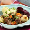 Skaka samman vatten och mjöl i en redningsbägare och häll ner i gry-tan under omrörning. Låt sjuda i 3 minuter. Smaka av med salt och pep-par. Servera köttet med kokt potatis och inlagda rödbetor.