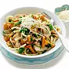 Fräs kantarellerna knapriga i smöret cirka 10 minuter. Salta, blanda i löken och pastan. Vänd ner kycklingskivorna. Peppra. Servera med riven parmesan.