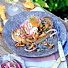 Picklad lök: Skiva löken tunt. Blanda socker, vinäger, timjan och en nypa salt. Rör tills sockret löst sig. Blanda i löken och låt dra minst 1 timme. Rör då och då så att löken mjuknar.