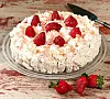 Ta en remsa och rulla ihop den. Lägg den på en flat tallrik eller en löstagbar kakformsbotten. Fortsätt att snurra remsorna en efter en utanpå den föregående tills remsorna är slut. Vispa grädden till skum och spritsa den över tårtan. Garnera med bär och mandelspån.