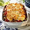 Vispa äggvitorna till hårt skum och blanda med crème fraiche. Bred ovanpå kasslern och gratinera i 20 minuter.