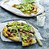 Blanda yoghurt, gräslök, salt och peppar och klicka på pizzorna eller servera det till. Strö över rucola.