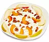 Hacka frukten och blanda med keso. Strö över hackade nötter och eventuellt lite kanel. Ät och njut!