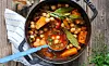 En vegetarisk gryta är lätt att variera med de grönsaker som finns till hands. Här får kikärtor och sötpotatis smak av spiskummin och den nord­afrikanska chilipastan harissa.