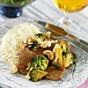 Lägg i broccolin och låt allt bli varmt. Strö över nötterna och servera med ris.