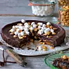 Topping: Smält chokladen över vattenbad och bred över kakan. Strö på grovt hackade jordnötter och marshmallows.