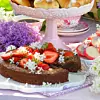 Häll smeten i en smord form med löstagbar kant 24 cm i diameter. Strö över hackad choklad och grädda i 20 minuter. Låt kakan kallna, och gärna stå i kyl över natten för att stelna. Servera med grädde och jordgubbar.