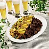 Blanda samman löken med potatisen och låt det bli genomvarmt. Lägg upp det på ena sidan av ett uppläggningsfat. Lägg köttet bredvid. Strö över hackad persilja. Häll äggulorna i små koppar och ställ dem i mitten.
