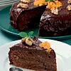 Bred chokladglasyren över kakan och ställ den svalt så att glasyren stelnar. Dekorera med hackade torkade aprikoser och valnötskärnor.