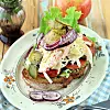 Skiva korven. Grilla eller stek den. Grilla eller rosta brödet. Skala och skiva löken.