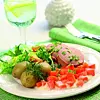Värm korvskivorna på en tallrik i mikron på full effekt, 1–2 minuter eller i en kastrull med kycklingbuljong. Servera med de stuvade morötterna, kokt potatis och sallad, och strö över persilja.