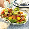 Slanta korven och stek i sitt eget fett tills den fått färg. Skölj salladen och blanda med delade tomater, skivad lök och avokado i bitar.