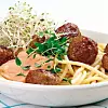 Rör samman minifraiche och tomatketchup i en skål. Smaka av med salt och peppar och servera till köttbullarna tillsammans med nykokt spaghetti och alfalfagroddar.