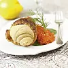 Vid servering ställ en smördegskon i taget i ett glas, spritsa i krabbmousse och lägg på entréassiett. Pynta med rom och dill.